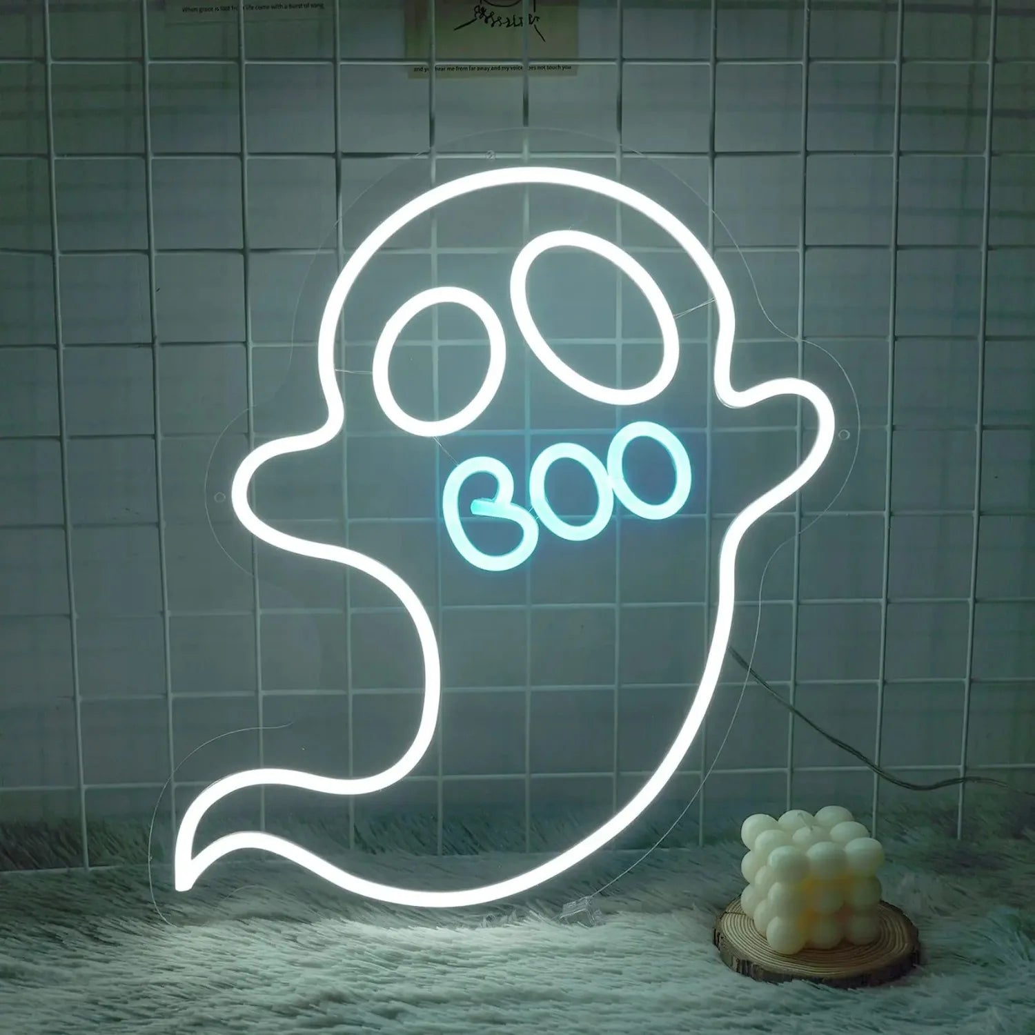 - Cute Ghost Design: A fun and friendly ghost outline that lights up in bright neon hues.